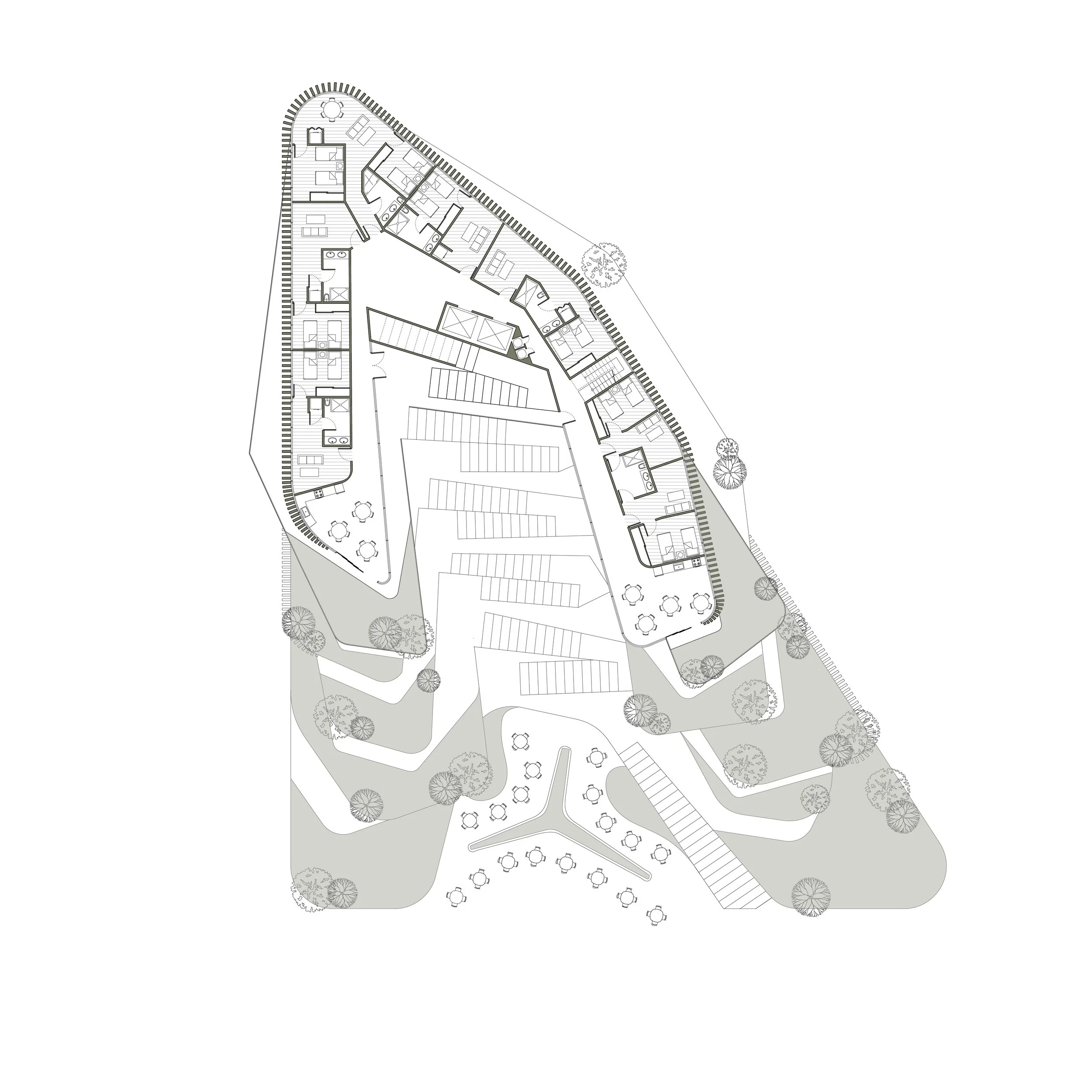 The project features affordable dorm-style apartments, each complemented by shared community kitchens on every floor. These kitchens, strategically positioned on the south side of the building, connect directly to terrace gardens, enabling residents to engage in sustainable food production. The design highlights food as a cornerstone of community life, with a vibrant ground-floor food market for distribution and a rooftop restaurant that celebrates culinary experiences. The building’s massing is thoughtfully crafted to foster interaction through a variety of communal spaces that promote social connection among both residents and visitors.