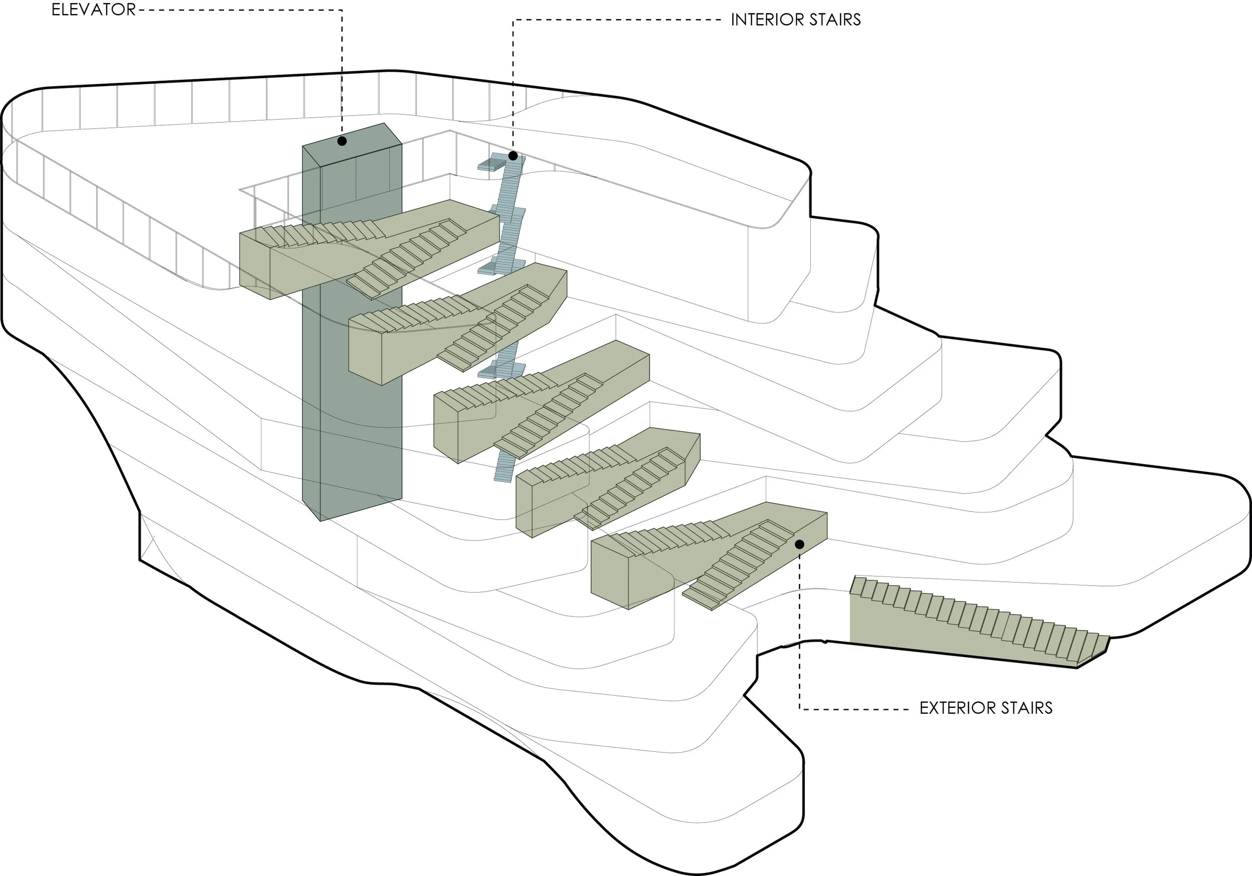 The architectural expression is both functional and aesthetic, featuring a curtain wall glass façade with vertical slats that mitigate harsh sunlight while enhancing energy efficiency. A striking series of grand stairs on the south façade serves as more than just a circulation element—it is a vibrant communal hub for gathering, relaxation, and interaction. By prioritizing affordability and sustainability, this Olympic Village aspires to create an enduring living environment that celebrates community, fosters social interaction, and reimagines the shared experience of food and sustainability in urban living.