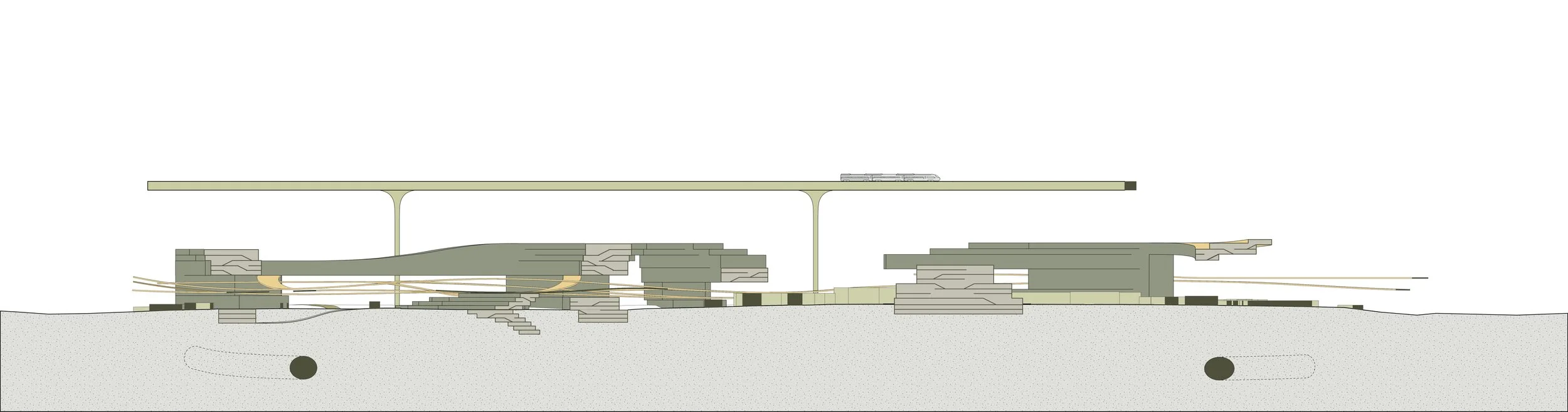 With the addition of a ring loop network that encircles the square mile footage, it holds most of the automobile traffic and connects various points within the circle while reducing car traffic usage. Furthermore, the addition of the massings is not only for residential and commercial usage. They are also land bridges—they pass over, intersect, and sit on existing conditions. Where the freeway used to divide, now it is readily accessible.