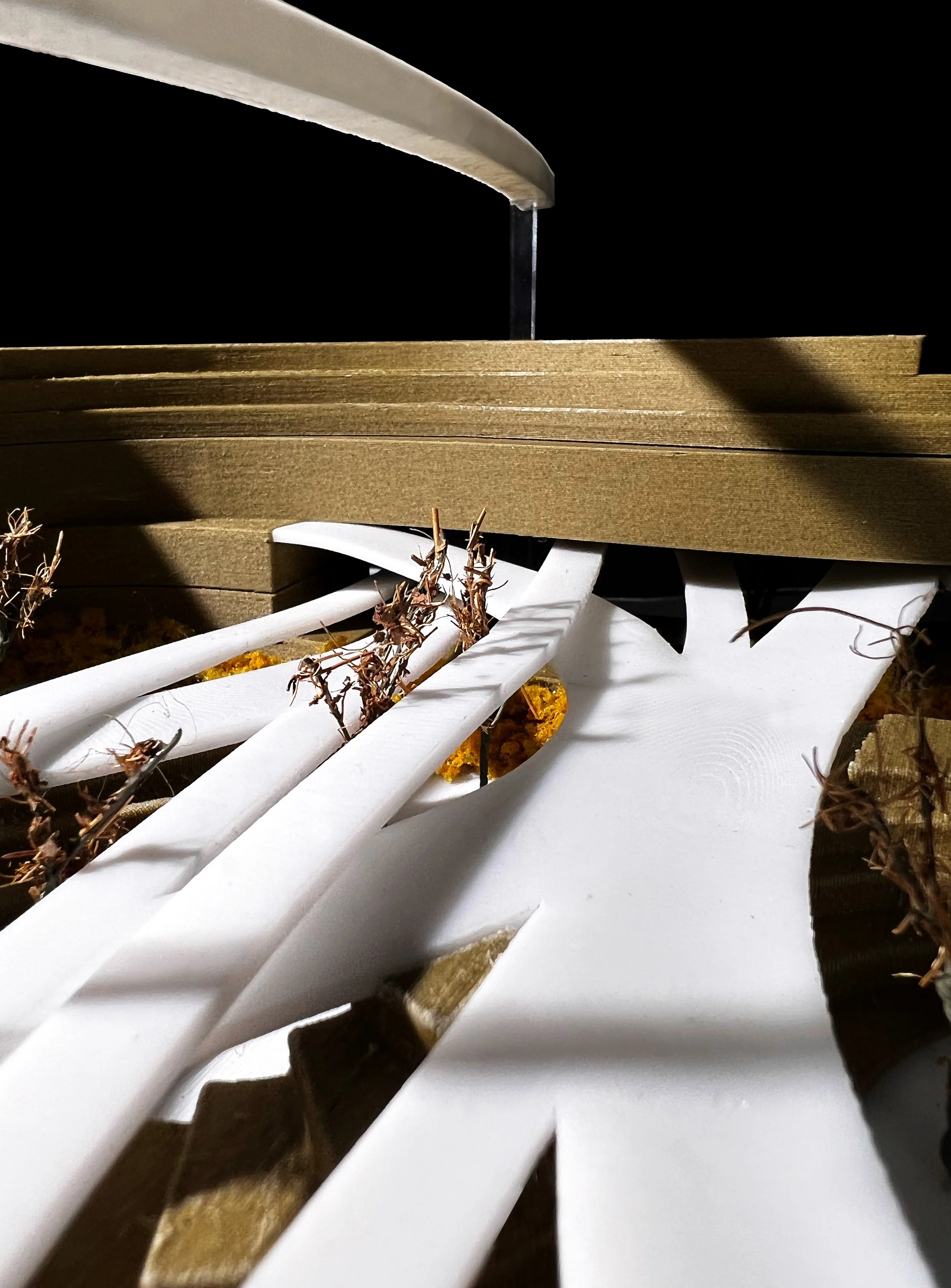 This interactive architectural model showcases the application of my design system in response to population growth. The ribbon-like building sections are designed for effortless replication and stacking, allowing adaptation to various existing or intervening conditions. Users have the flexibility to physically stack each level in their preferred arrangement, leading to diverse design possibilities tailored to meet the needs of the occupants utilizing this space.