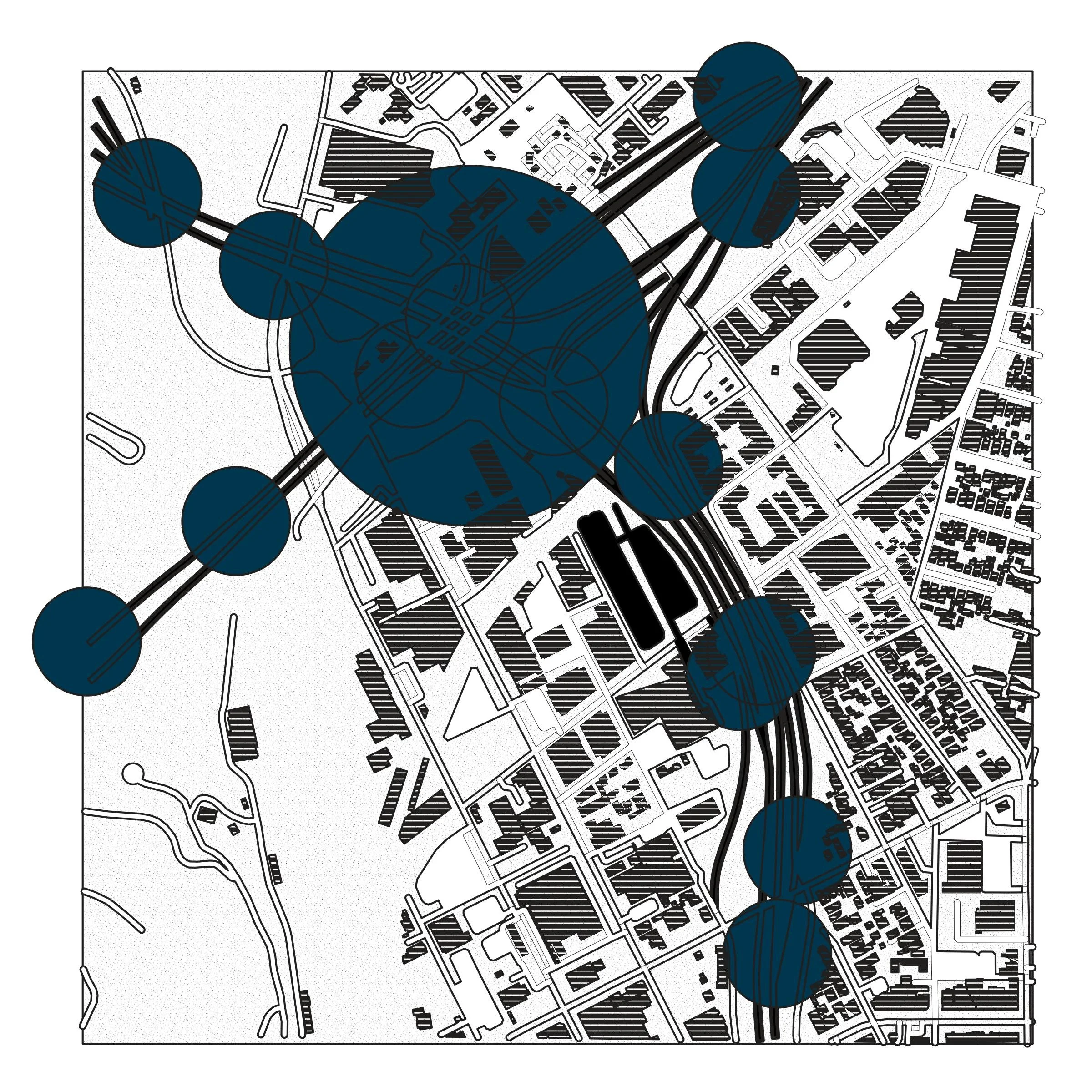 The radii analysis is part of the conceptual being of our massing. Not only do these ribbon structures intersect with the surrounding conditions, but, they also harmonize and form geometric relationships with one another. They are bounded within two large radii—the largest being a fourth of a circle. Where the freeway system became the densest, so did the intersection of the radii. The hatches reflect the densities of the massings which in term refers to the density of the square mile footage.