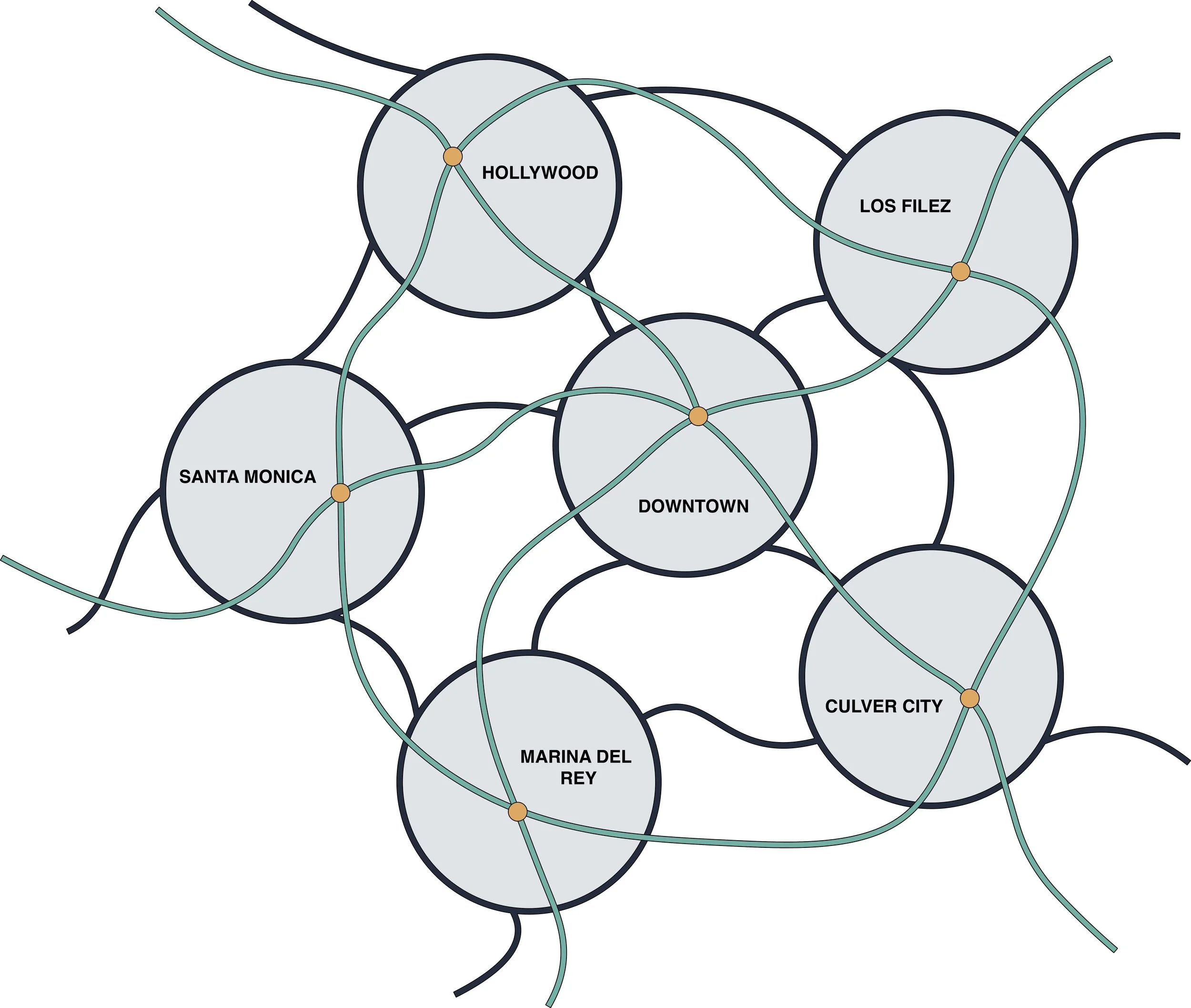 We created the ring system as a modular unit. The freeway system cut through not only the urban fabric but also the social fabric of Los Angeles. Within the circular system, we can avoid cutting through neighborhoods and creating a divide. The ring is equipped with a series of exit points and spokes connecting to other circular networks. In a way, this is kind of similar to the old freeway system, however, they do not create unoccupied spaces or divided spaces.